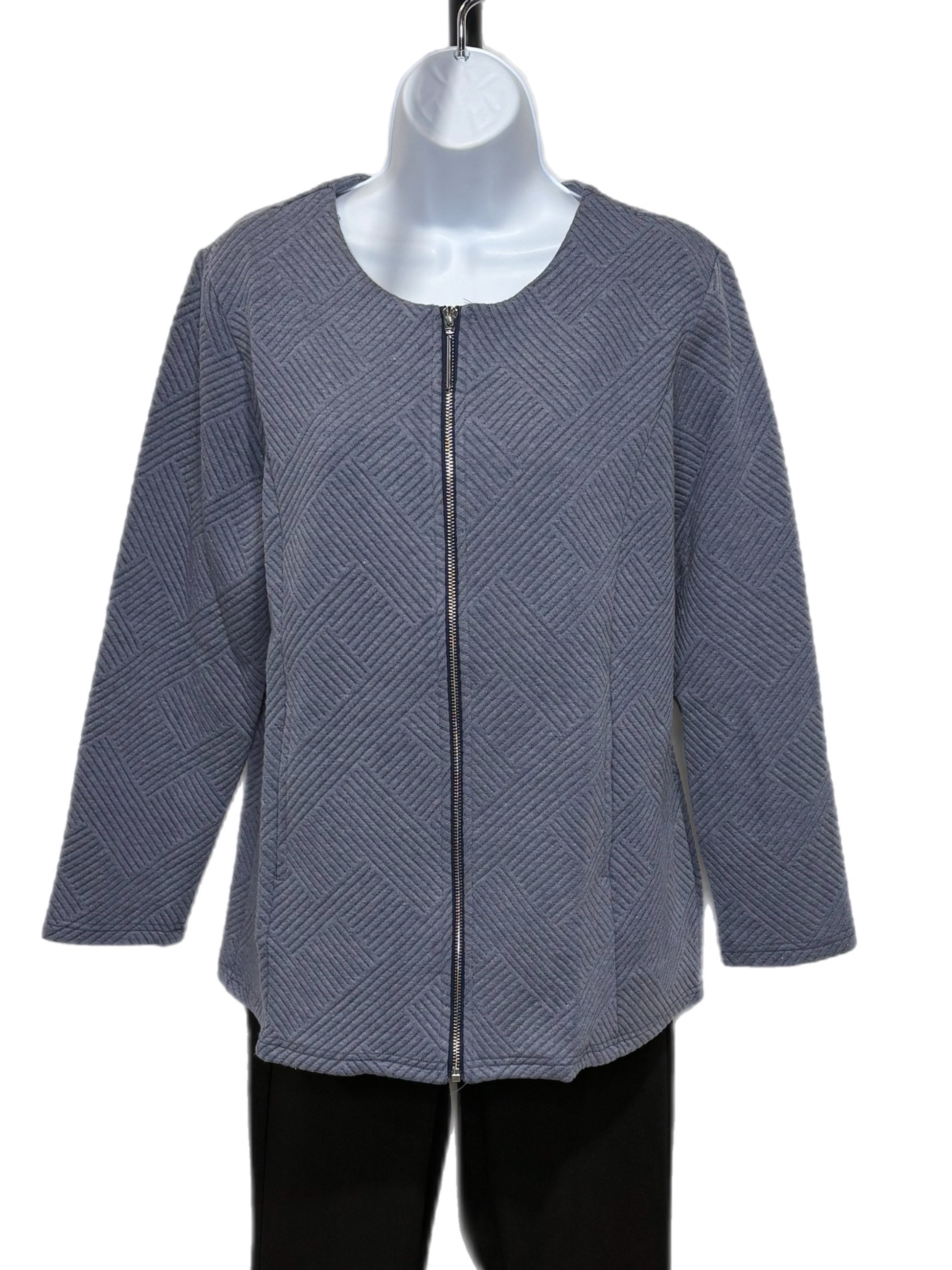 Step into effortless sophistication with this cloud blue jacquard jacket, a versatile layering piece that blends comfort with modern polish. Designed with a collarless silhouette and a clean zip-front closure, this jacket offers a sleek, contemporary look that transitions seamlessly from weekday chic to weekend casual.