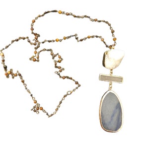 Elevate your jewelry collection with this gorgeous hand-made, one-of-a-kind beaded statement necklace, featuring exquisite natural stone drops in soft shades of grey, blue, and white. This elegant necklace, measuring approximately 30 inches in length, plus the additional drop pendants, is the perfect blend of nature’s beauty and artisanal craftsmanship. Whether you’re dressing up for an event or looking to add a touch of sophistication to your everyday outfits, this necklace will quickly become a cherished piece in your wardrobe.