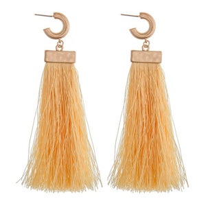 The open hoop design creates a modern and minimalist base, while the huggie-style closure ensures a comfortable and secure fit. These earrings hug the earlobe delicately, offering both style and stability for all-day wear. The real showstopper, however, is the long gold fringe tassel that cascades from the hoop, adding movement and texture to the overall look. As you move, the tassels sway gracefully, creating a sense of elegance and fluidity that makes these earrings truly stand out.