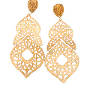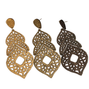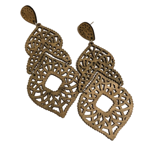 The design of these earrings features a triple-hinged structure that forms a large, elegant teardrop shape. This layered, geometric design adds a dynamic and eye-catching element, allowing the earrings to move gracefully as you do. Each section of the earring is carefully crafted from smooth, lightweight wood in varying shades of brown, giving them a natural, rustic appeal while maintaining a polished, sophisticated look.