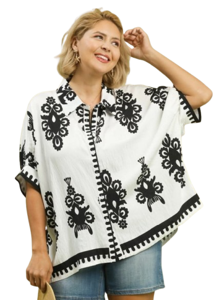 Bold yet effortlessly wearable, this Abstract Print Oversized Button Down Top is the perfect statement piece for women who love relaxed style with a modern edge. Featuring a soft white base accented with an eye-catching black abstract print, this top delivers visual interest without sacrificing comfort—making it an easy standout in any wardrobe.