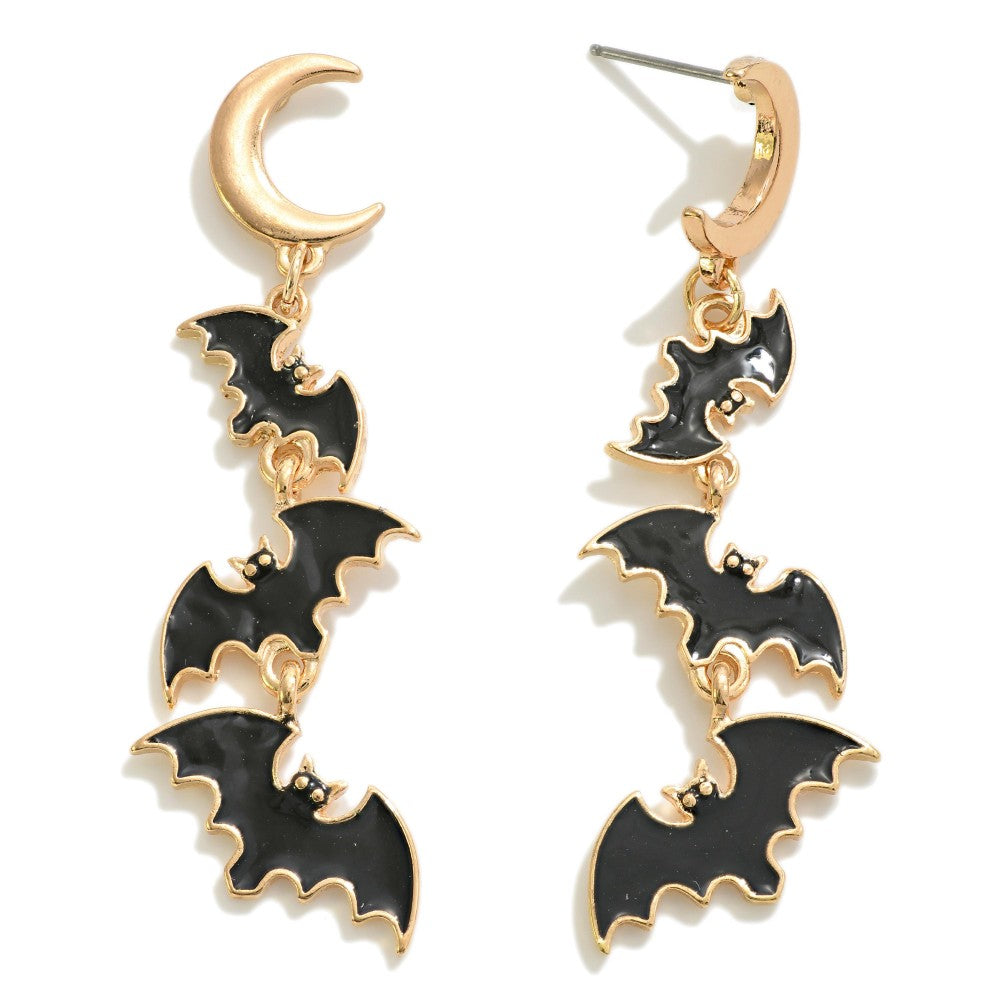 Measuring approximately 2.25 inches in length, these earrings provide the perfect balance between subtlety and statement, making them versatile enough to pair with both casual outfits and more dressed-up looks. The sleek enamel finish on the bat design adds a polished, modern touch that stands out while maintaining a fun Halloween vibe.