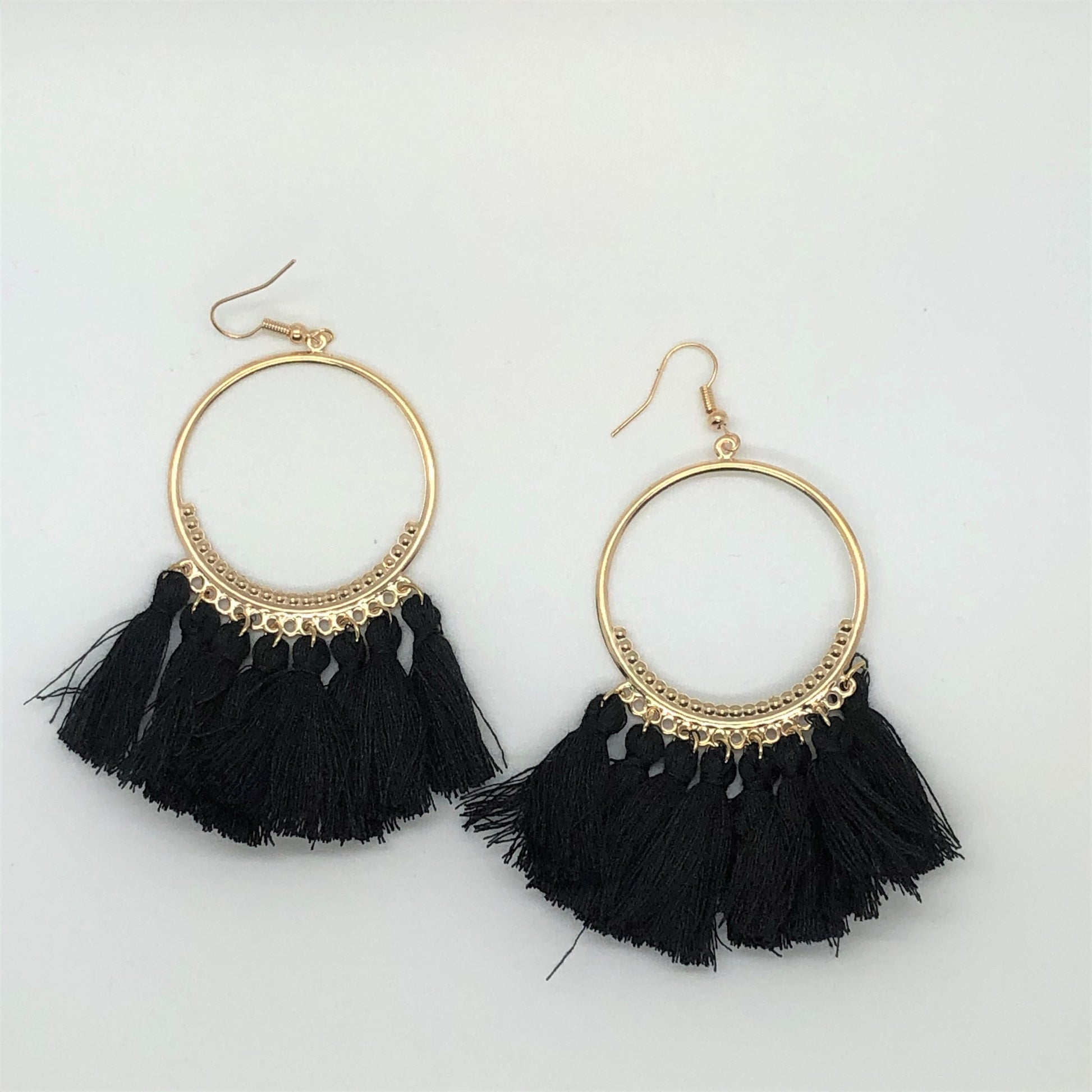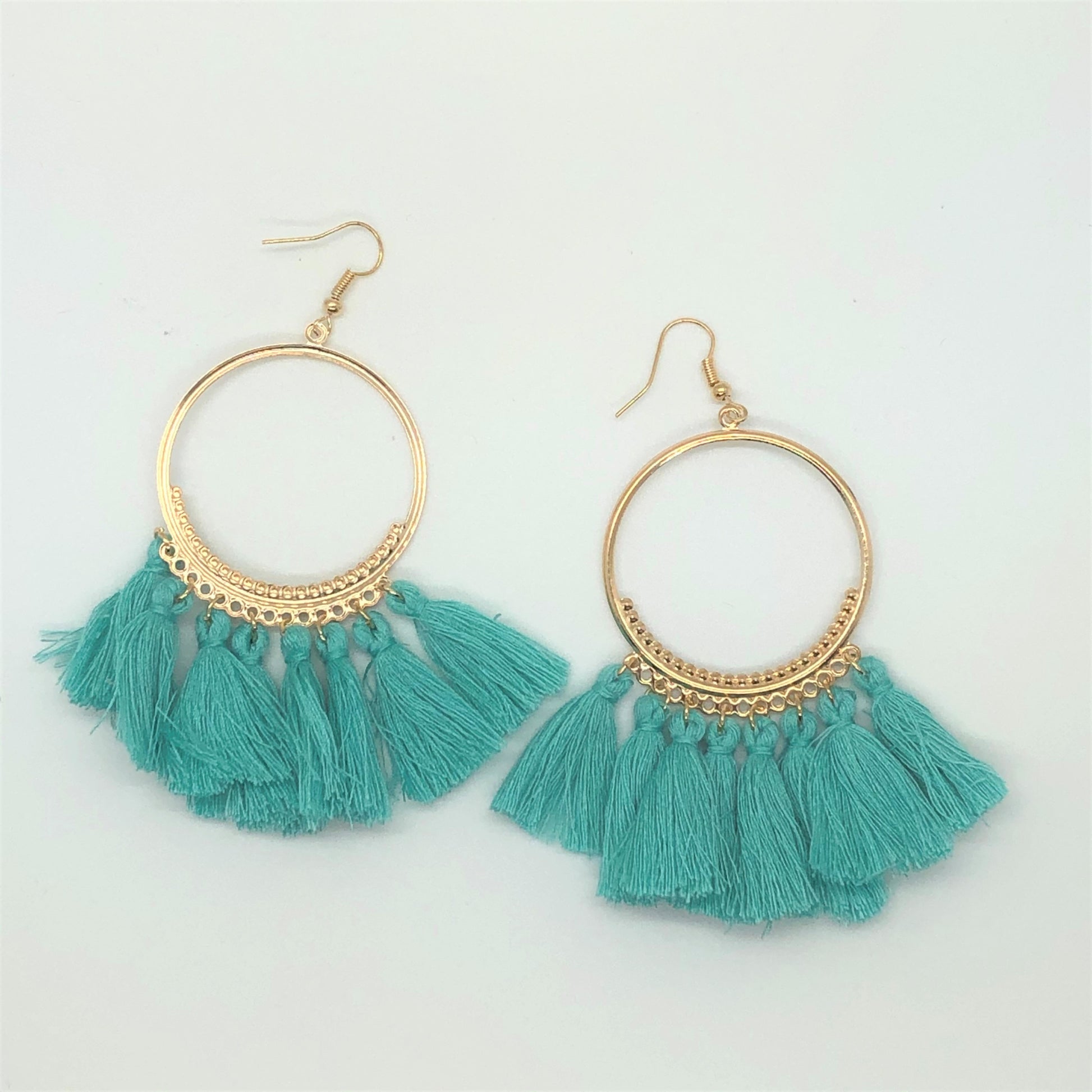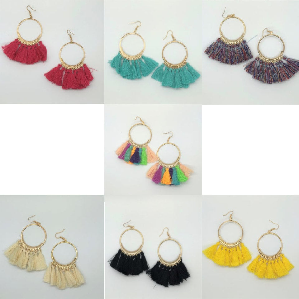 The design of these earrings showcases eight tassels in a variety of solid colors, allowing you to choose the pair that best suits your personal style or mood. The tassels, which hang from the sleek gold-tone open circle, create a dynamic sense of movement, making them eye-catching and perfect for those who love accessories that sway and dance with every step. The tassels themselves are made from soft, high-quality thread, ensuring they hold their shape while maintaining a soft, lightweight feel.