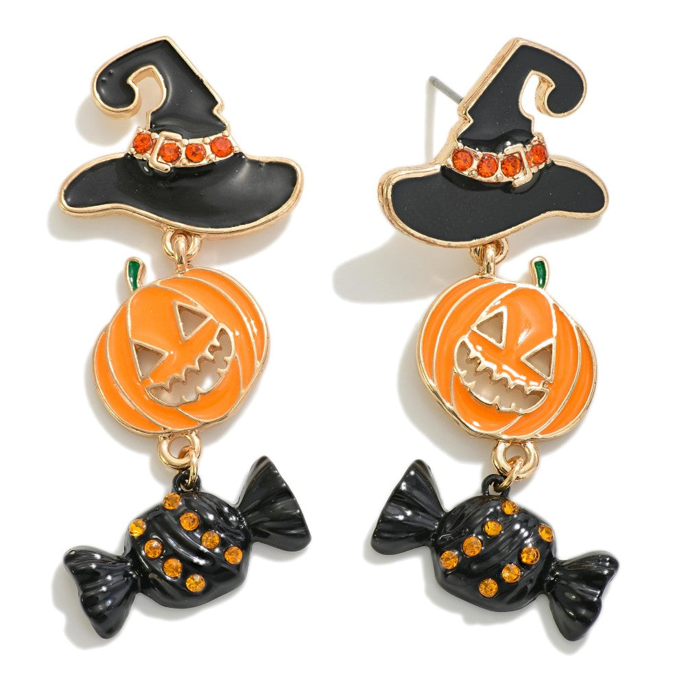 The intricate enamel detailing brings each element to life, with the black witch hat featuring subtle curves, the orange pumpkin showing off its classic ridges and a smiling jack-o'-lantern face, and the wrapped candy at the bottom adding a whimsical touch with its twisted ends. Rhinestone accents throughout the design give the earrings an extra sparkle, ensuring you stand out whether you're at a Halloween party or just enjoying the festive season.