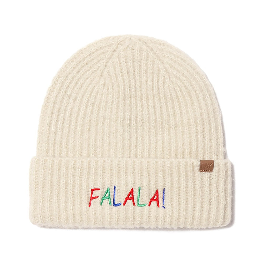 The cream base of the beanie provides a soft, neutral backdrop that’s easy to pair with any outfit, while the bright 'FaLaLa!' lettering across the front brings a playful and festive vibe. The multi-colored embroidery pops beautifully against the cream knit, making it an eye-catching piece without being too bold. This hat is perfect for those who want to add a touch of holiday fun to their look while still keeping things subtle and stylish.