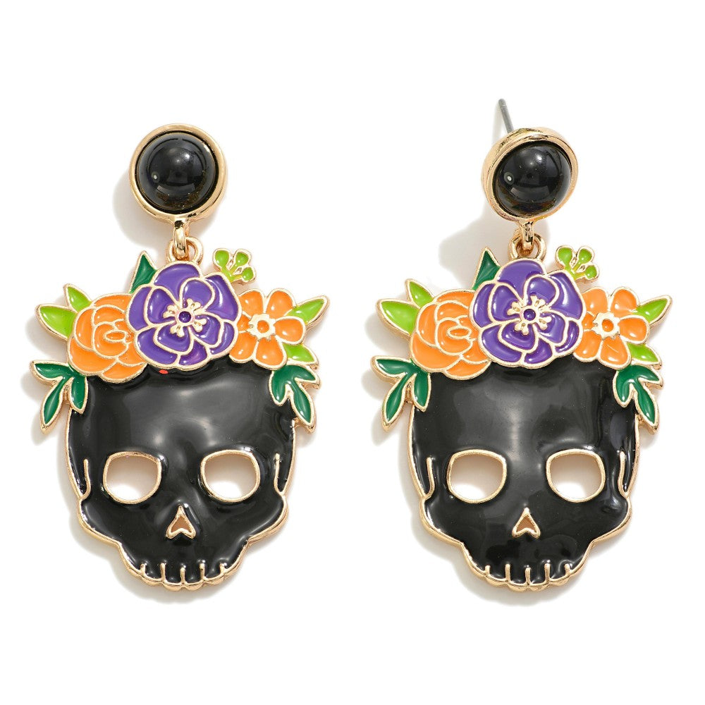 Measuring approximately 1.75" in length, these earrings feature an intricately detailed skull design with delicate flower accents, giving them a whimsical yet edgy vibe. The skull is adorned with beautifully crafted flowers, adding a soft, feminine touch to the boldness of the skull motif. This contrast between the spooky and the sweet makes these earrings the perfect balance of fun and fashion.