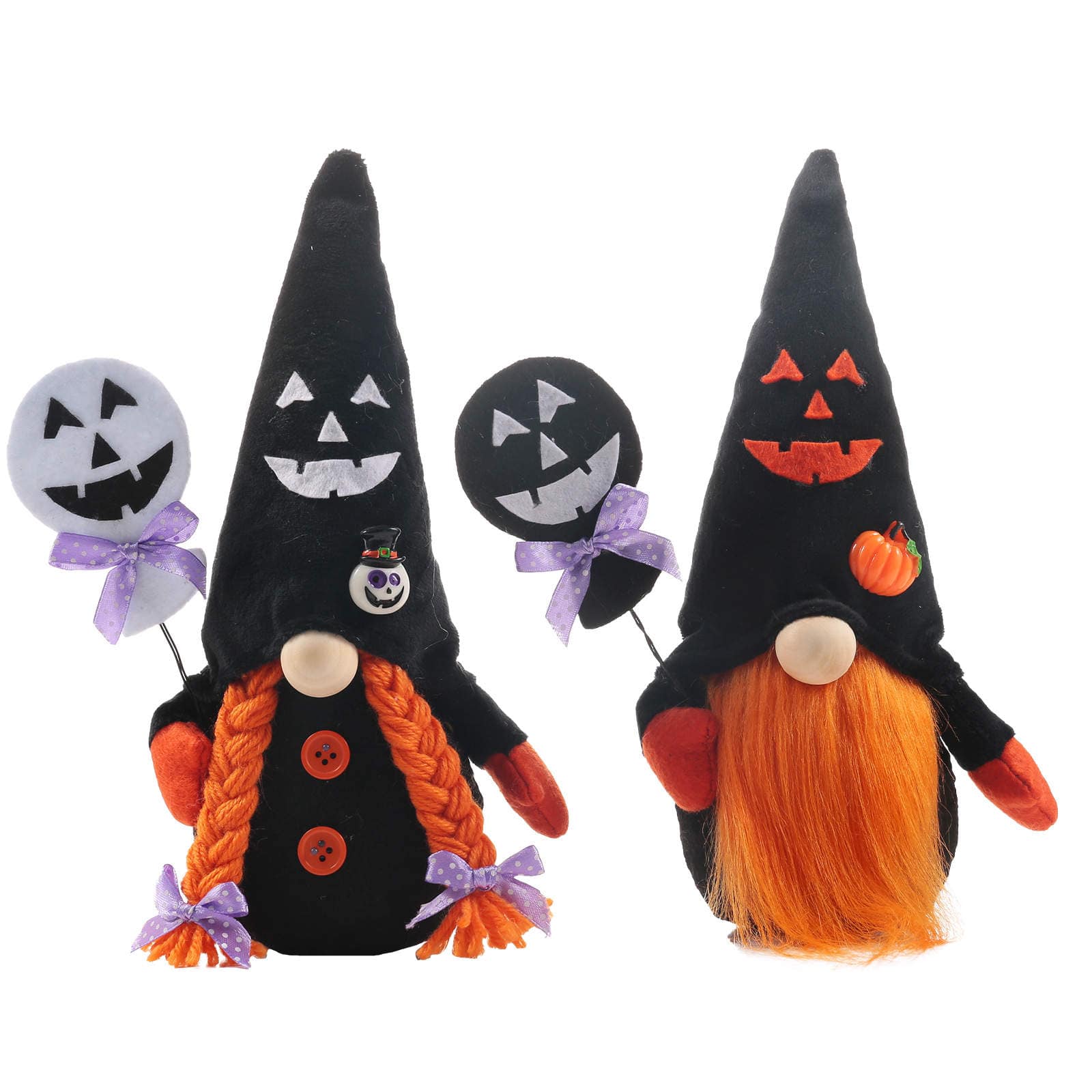 Adorable gnome set. One gnome has braids, is dressed in black and is holding a white pumpkin face balloon. The second gnome dressed in black has an orange beard and is holding a black pumpkin face balloon.