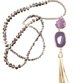 Make a bold and elegant statement with this gorgeous hand-made one-of-a-kind beaded statement necklace. Crafted with attention to detail and artistic flair, this piece showcases a stunning combination of rich purples and shimmery silver beads that come together to create a look that is both sophisticated and unique. Measuring approximately 32 inches in length, with additional pendant drops that add extra elegance and flair, this necklace is the perfect way to elevate any outfit.