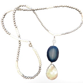 Add a touch of elegance and artistry to your wardrobe with this gorgeous hand-made, one-of-a-kind statement necklace, featuring a beautiful combination of silver and white beads that lead to a breathtaking turquoise-colored slice and white druzy pendant drop. Measuring approximately 30 inches in length, plus the additional pendant drop, this necklace is the perfect way to make a sophisticated statement, whether you’re dressing up for a night out or adding a unique accent to your everyday style.