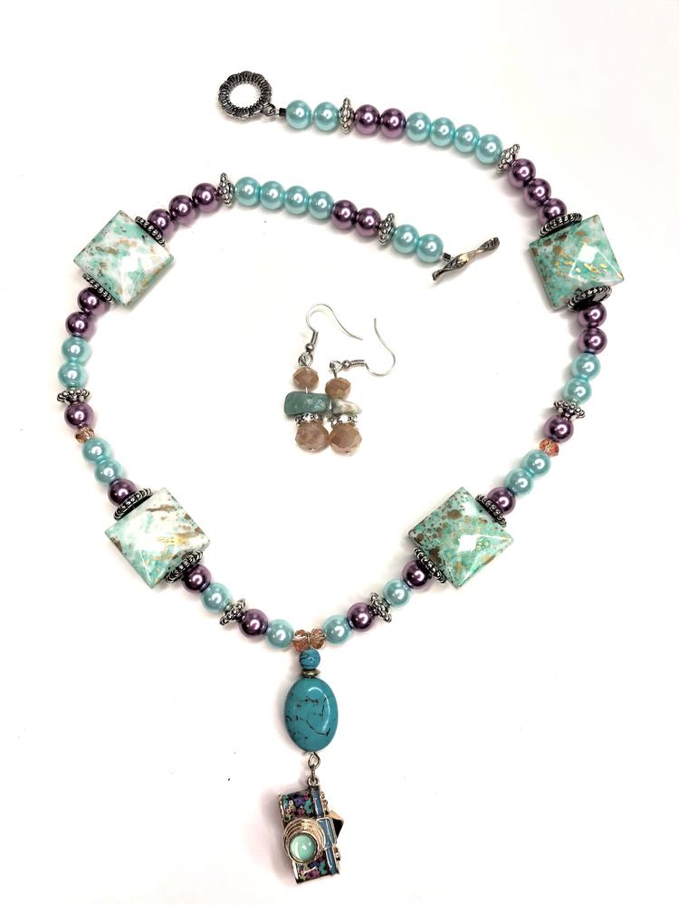 The set is completed with matching 2-inch earrings, featuring the same aqua and lavender beads with silver-toned hardware. These earrings are lightweight and easy to wear, providing the perfect complement to the necklace without overshadowing its playful charm. Together, the necklace and earrings create a cohesive look that’s both fun and fashionable.
