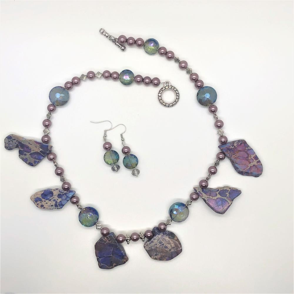 Keywords: agate necklace, handmade jewelry, lavender glass pearls, silver-toned beads, statement necklace, chunky agate slices, unique jewelry set, elegant necklace set.