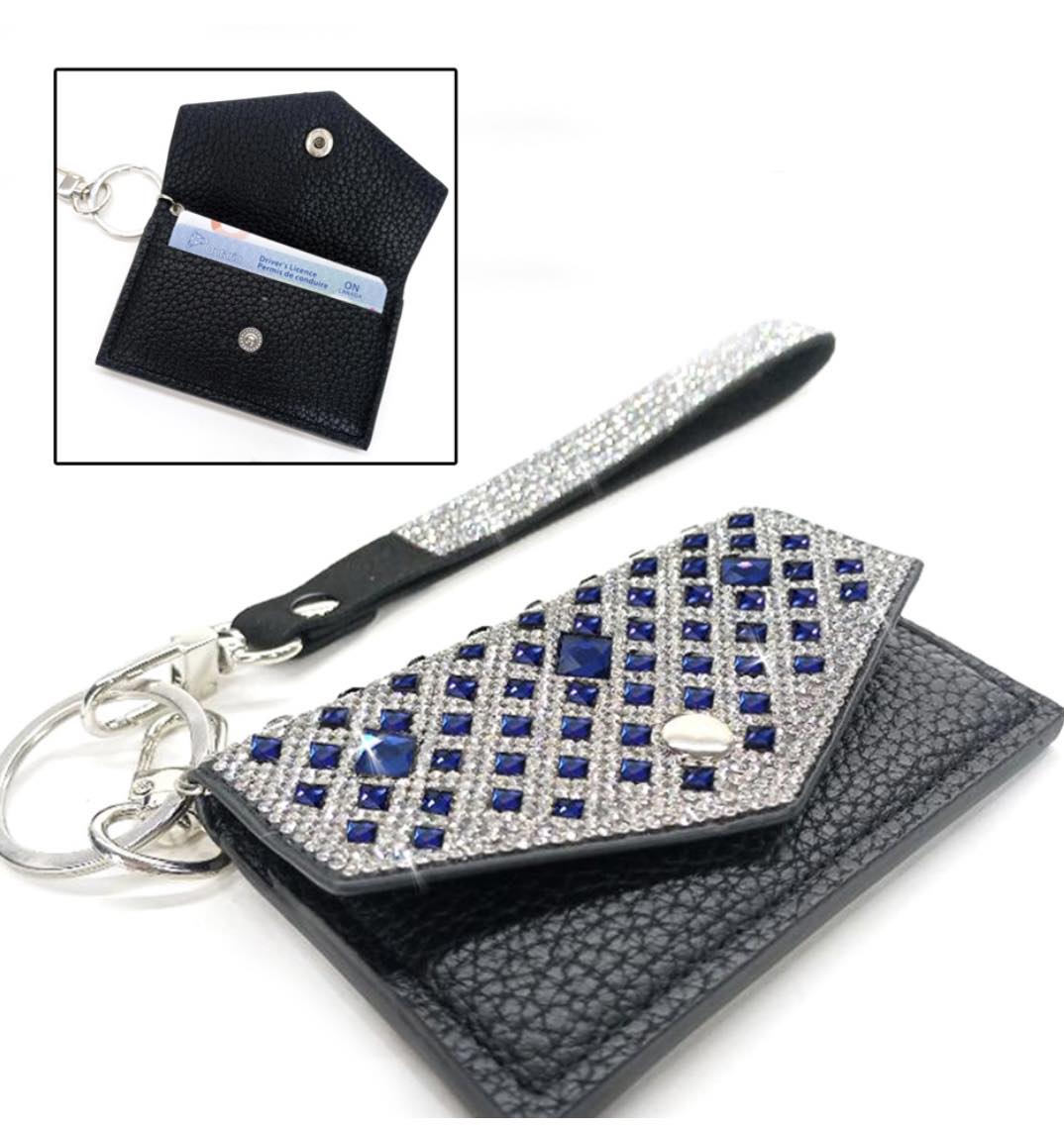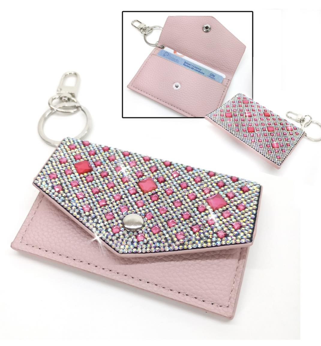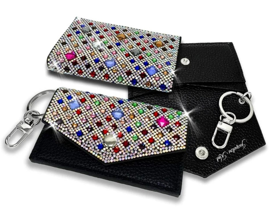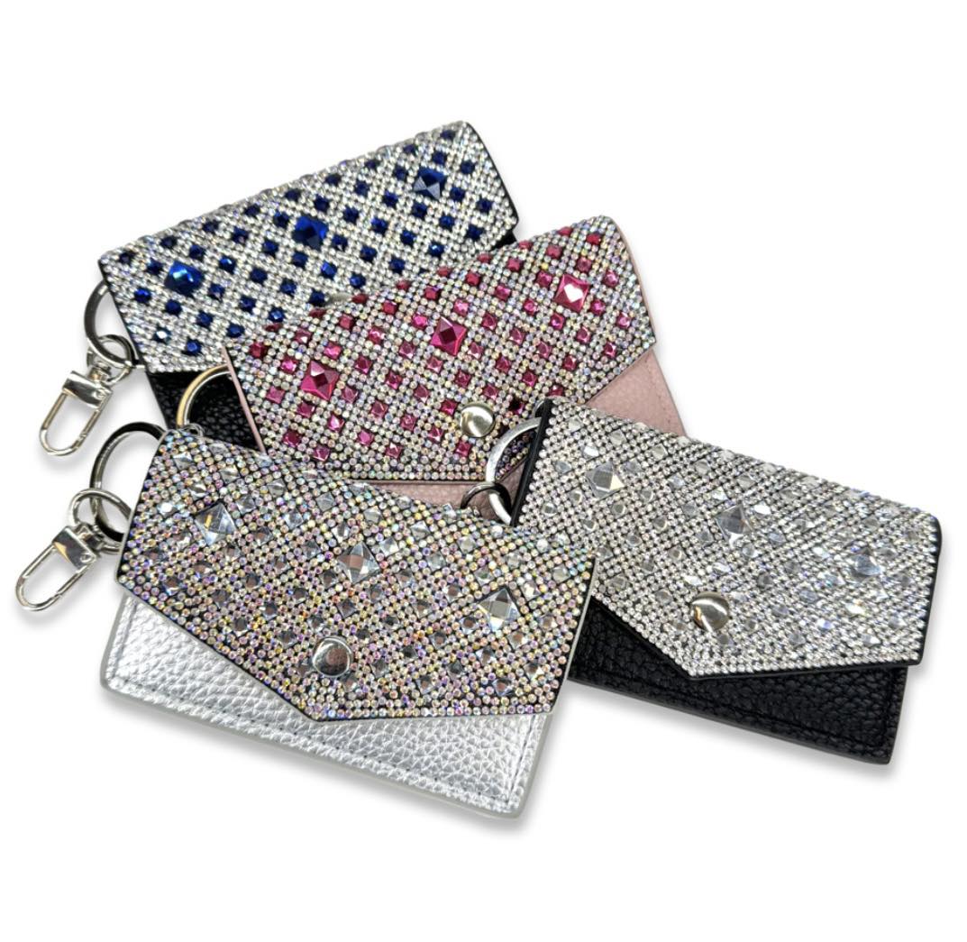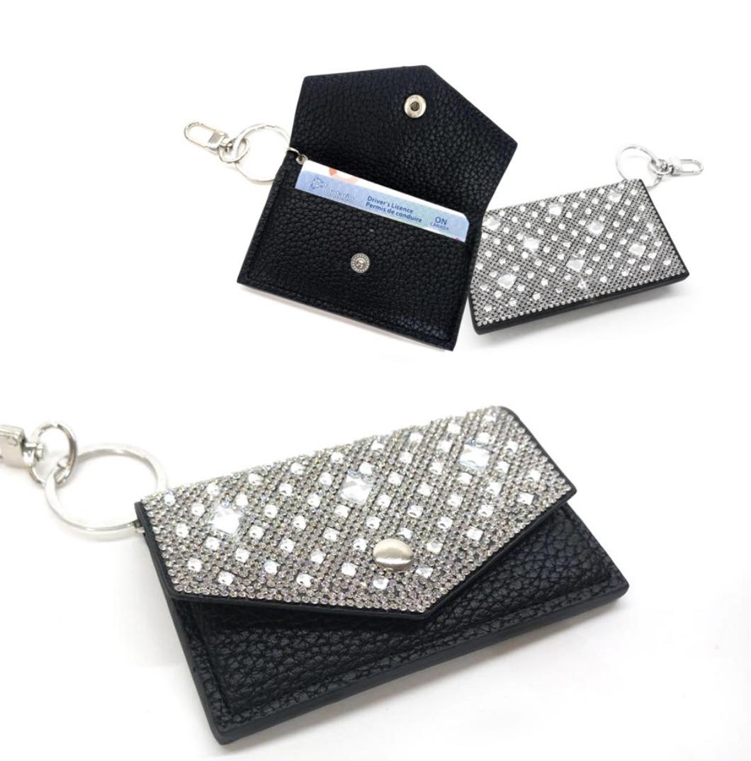 Take carrying around cash and a few cards to the next level with our stunning card purses. They come in 4 glorious colorways and each one is fully encrusted with crystals on the backside and top closure, with a coordinating faux leather front. Each one is also elegantly housed in their own beautiful silver and black sparkle gift box. Attached keyring means you can carry this everyday along with your keys or you can attach it to a larger purse as a go-to accessory.
