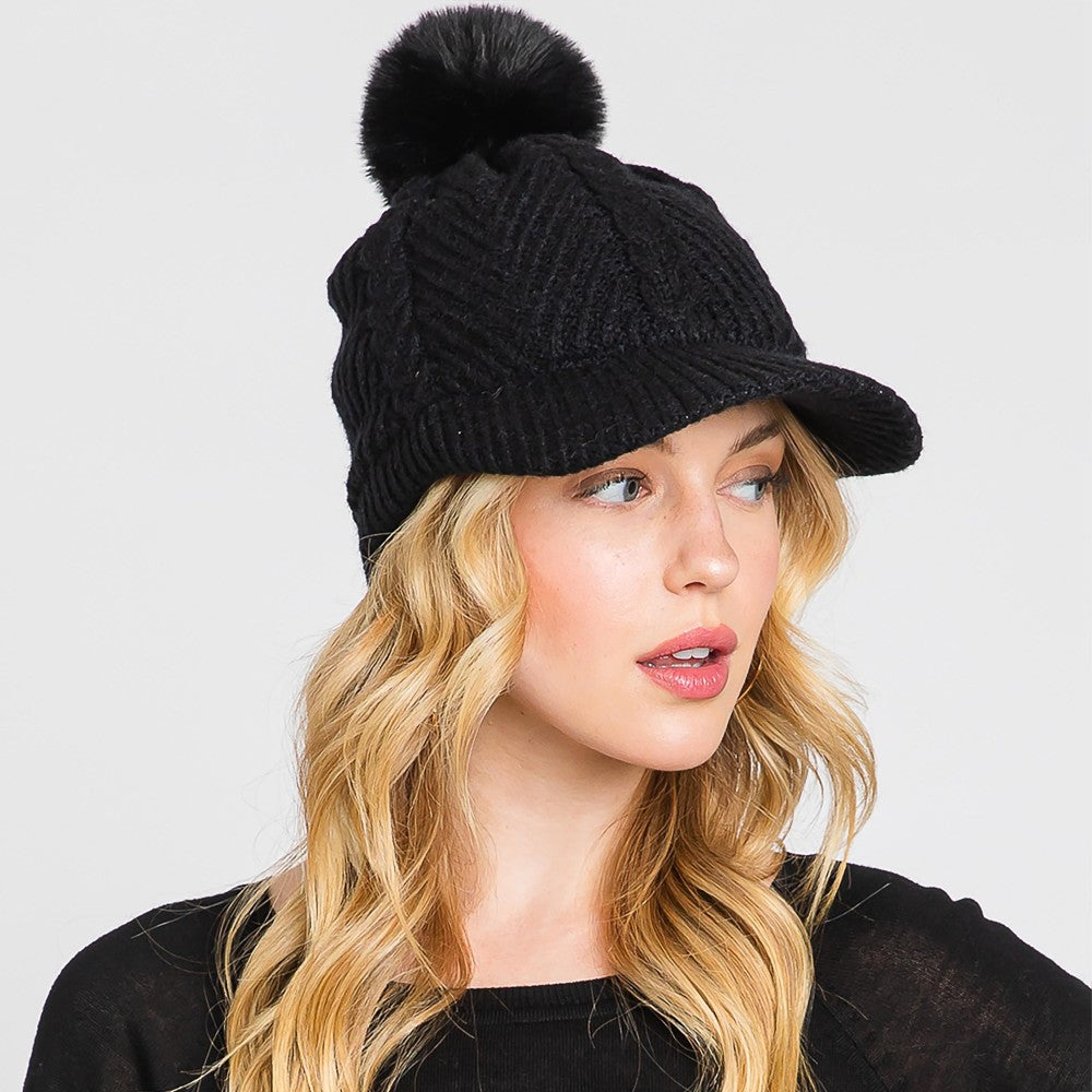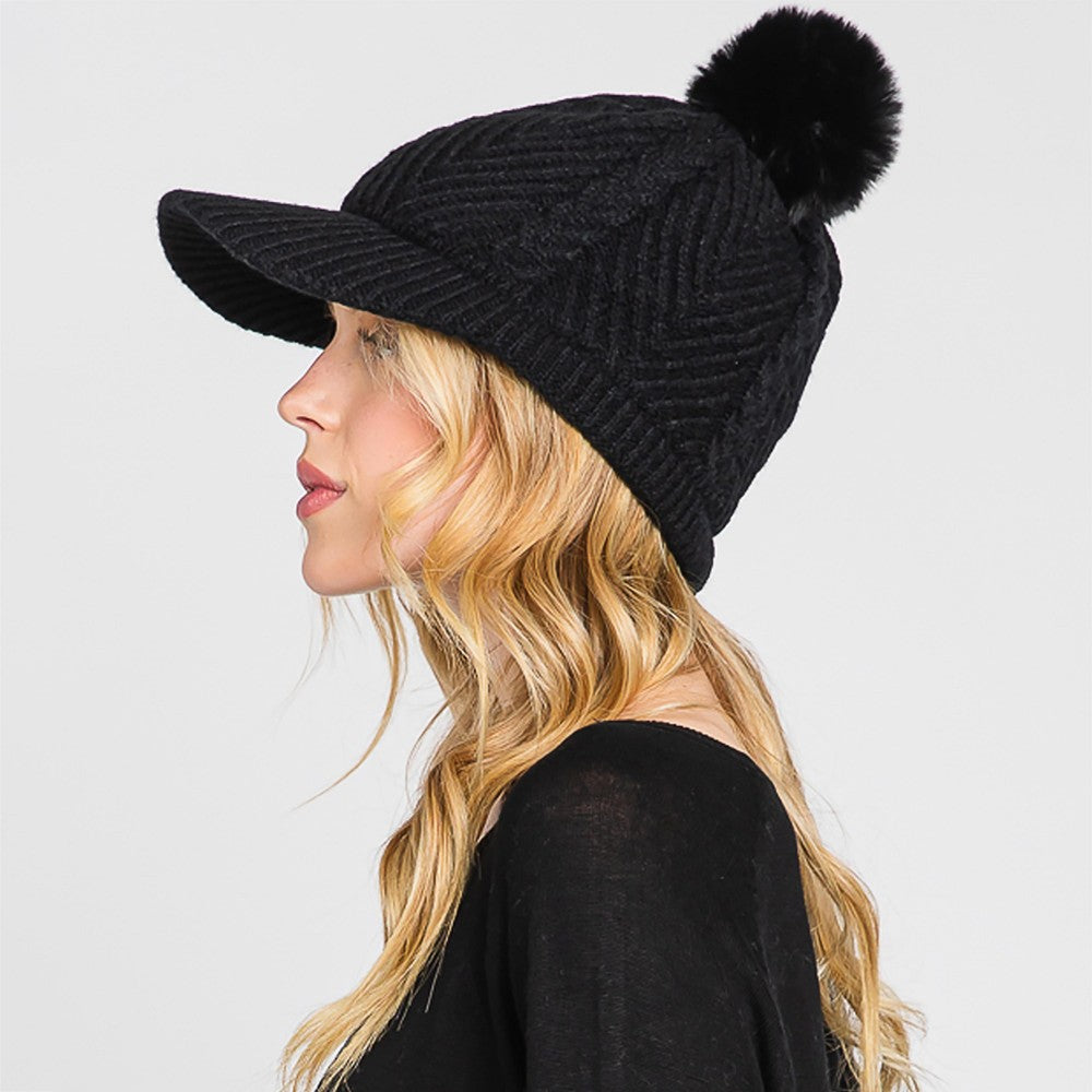 Knit Brimmed Beanie With Faux Fur Pom – Cozy, Chic, and Perfect for Winter