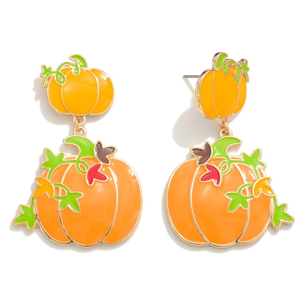 The pumpkin design is carefully crafted with a smooth enamel finish that gives the earrings a vibrant and polished look. The bright orange pumpkin is complemented by delicate green and red leaves, adding an extra pop of color and detail. These seasonal earrings embody the warmth and coziness of fall, capturing the essence of harvest time and all things pumpkin. The linked structure of the pumpkin and leaves allows for slight movement, adding dynamic flair and a bit of playful elegance to your ensemble.