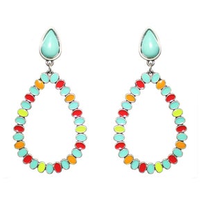 Elevate your accessory game with these stunning turquoise stud earrings, featuring a vibrant multi-colored stone teardrop. Measuring approximately 2 inches long, these earrings are the perfect balance of bold color and elegant design, making them a statement piece for any jewelry collection. The combination of the turquoise stud and the colorful teardrop detail adds a pop of sophistication and charm to any outfit, whether you’re dressing up for a special occasion or simply adding flair to your everyday look.