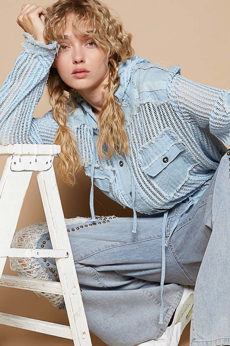 Open Weave Button-Down Hoodie Top – Effortless Style with a Touch of Edge