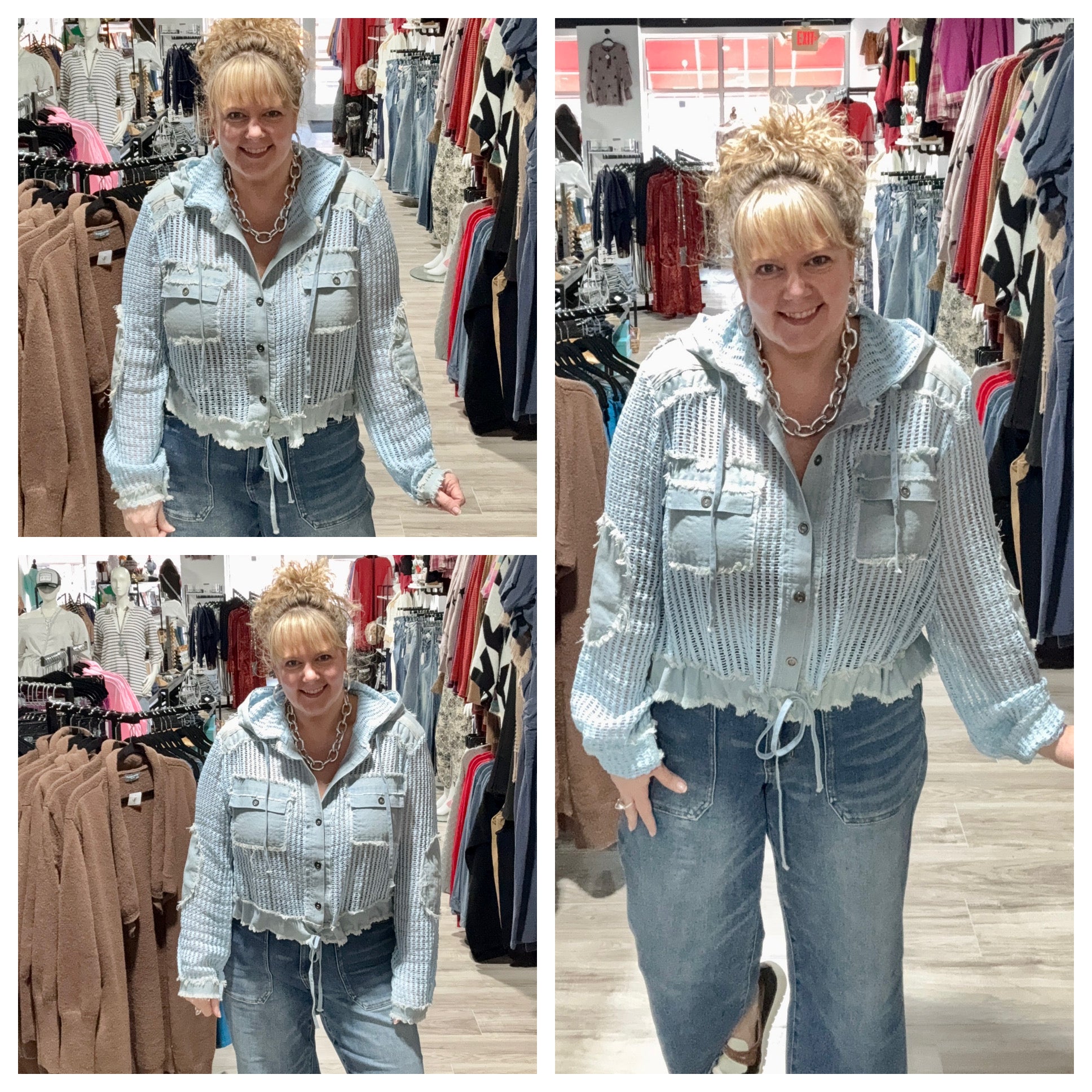 Elevate your casual wardrobe with this Open Weave Button-Down Hoodie Top, designed to offer both style and comfort in a lightweight, breathable fabric. Featuring a textured woven pattern in soft light blue tones or gorgeous black, this hoodie combines chic design with a laid-back boho vibe that you’ll love to wear again and again. Sizing for this brand runs VERY oversized. Please note the recommendations for each size here and order accordingly: Small: Fits sizes 2-8, Medium: Fits sizes 10-16, Large: Fits sizes 16-20
