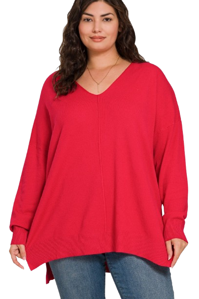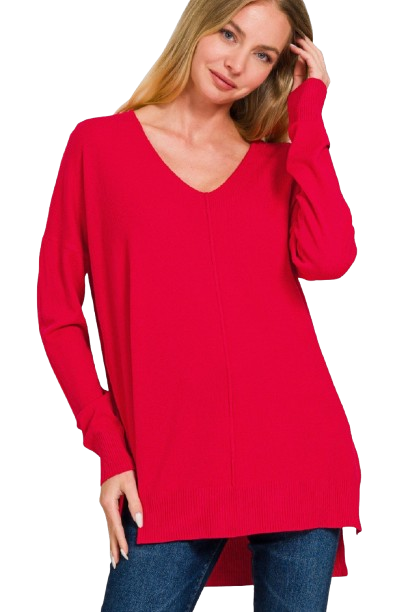 This gorgeous garment-dyed red sweater is oversized for a roomy fit, features a flattering v-neckline and center seam detail. All on a high low hem tunic length with side slits for ease of wear. This is going to be your new go-to for any occasion. The fabric is a gorgeous blend of 22% polyester/28% nylon/50% viscose which means the stretch and drape are phenomenal. It feels like a super fine gauge cashmere. Pair this with leggings, jeans or skirts. You cannot go wrong!