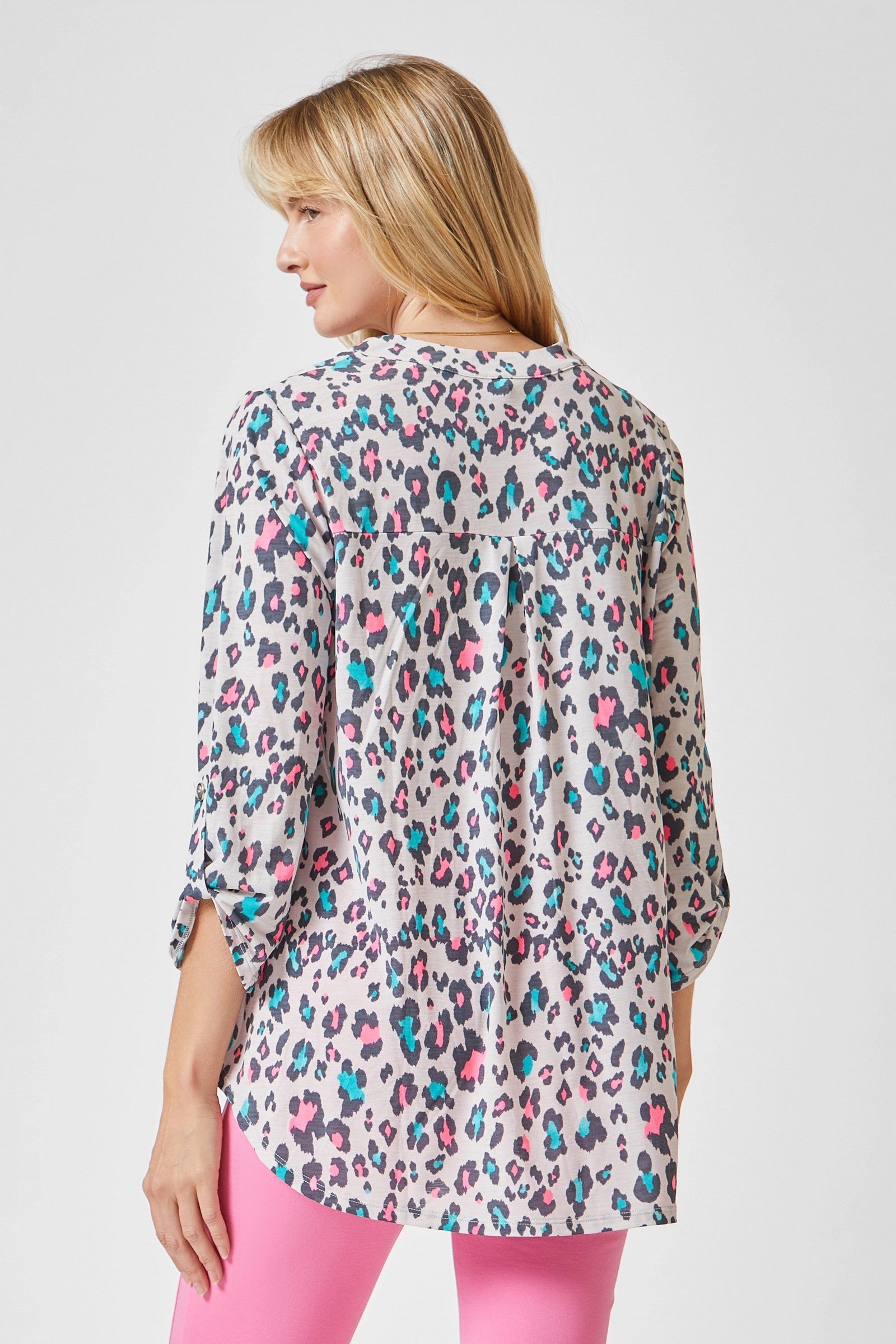 This fun cheetah top features a super comfortable, cool to the touch, poly blend which has luxurious softness with lightweight, wrinkle free comfort. This easy care fabric top is travel friendly, cooler than linen and other materials which makes your perfect ON THE GO wear. A mandarin collar neckline and 3/4" length sleeves with tab details. This soft ivory background is gorgeous against the pops of cheetah print done in pink, lavender, blue, and grey. The fit is relaxed and flowy with a slight high low. If you are between sizes, go with your smaller size.
