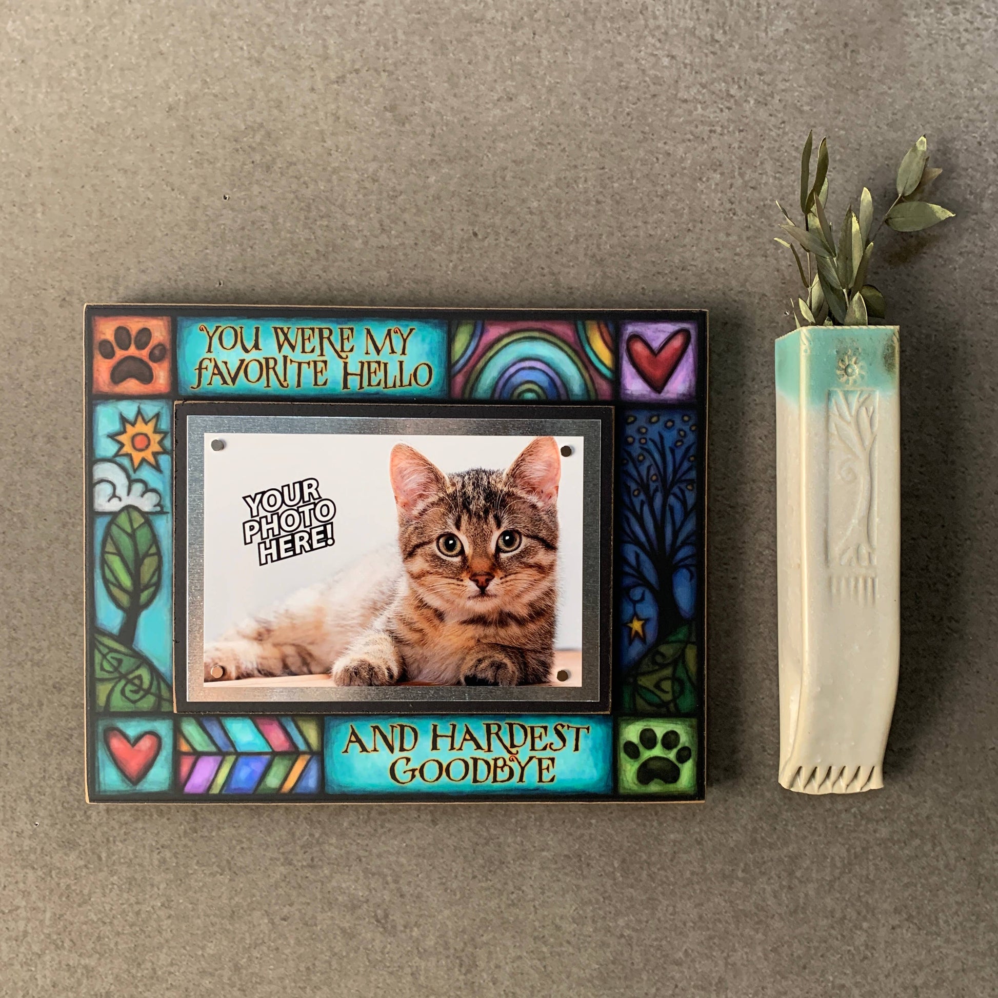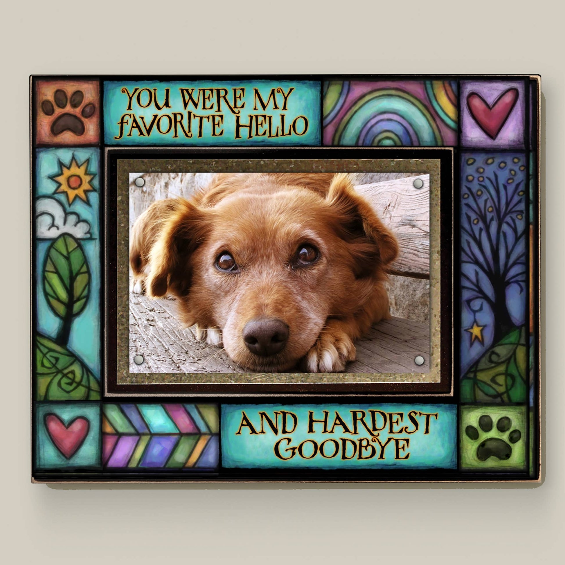 Keywords: Michael Macone frame, "Favorite Hello, Hardest Goodbye" quote, memorial picture frame, 8x10 wood frame, 4x6 photo frame, UV-coated artwork, remembrance gift, sympathy gift, pet memorial keepsake.