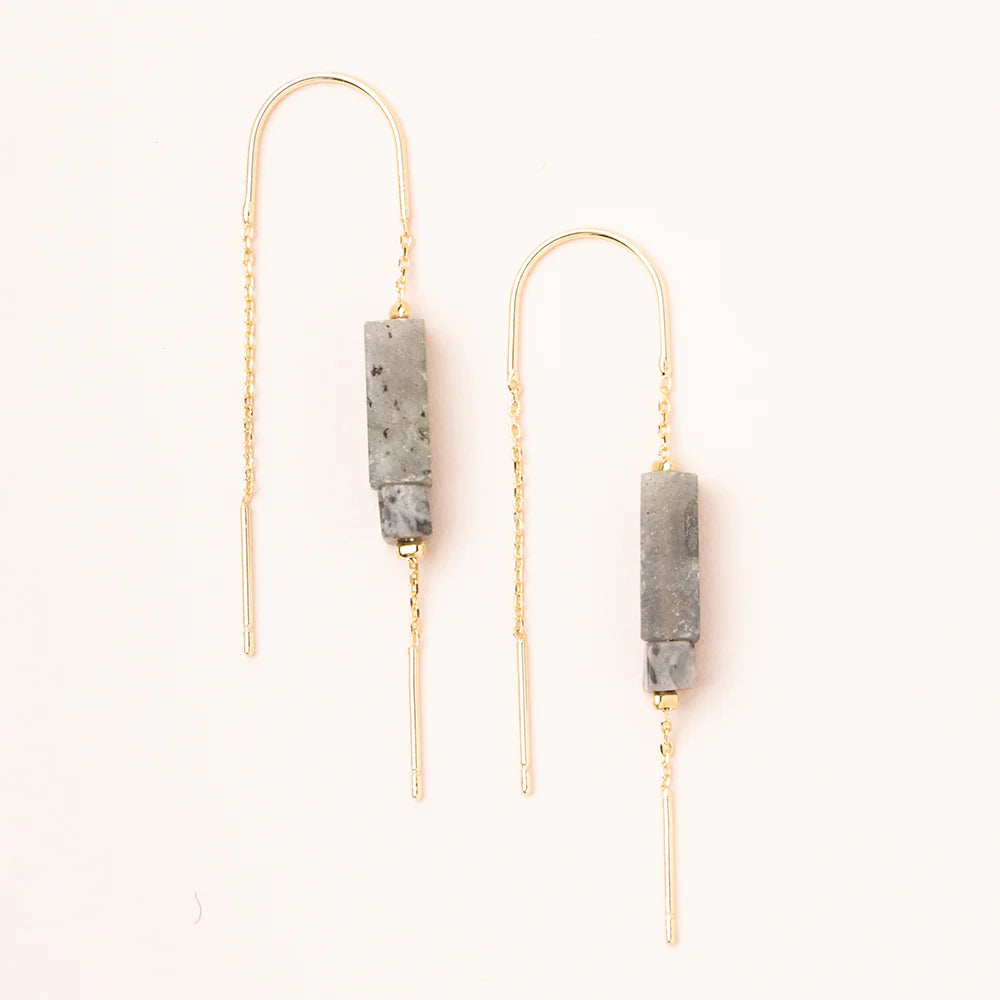 Each pair features an elegant 2.25” drop, showcasing semi-precious rectangular labradorite stones measuring ½” and 3/16”, suspended from delicate gold-dipped chain and wire. Known for its mesmerizing flashes of blue, green, and smoky gray, labradorite catches the light beautifully, creating a soft, ever-changing shimmer. Paired with warm gold accents, the look is polished, elevated, and quietly captivating.
