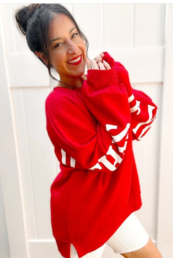 Bring a little holiday cheer (and a lot of cozy) to your wardrobe with this festive oversized red sweatshirt. Crafted from a premium cotton/poly blend scuba-style fabric, it offers the perfect mix of structure and softness. The inside features a brushed cozy lining that feels like a warm hug—ideal for everything from Christmas shopping to sipping cocoa by the fire.