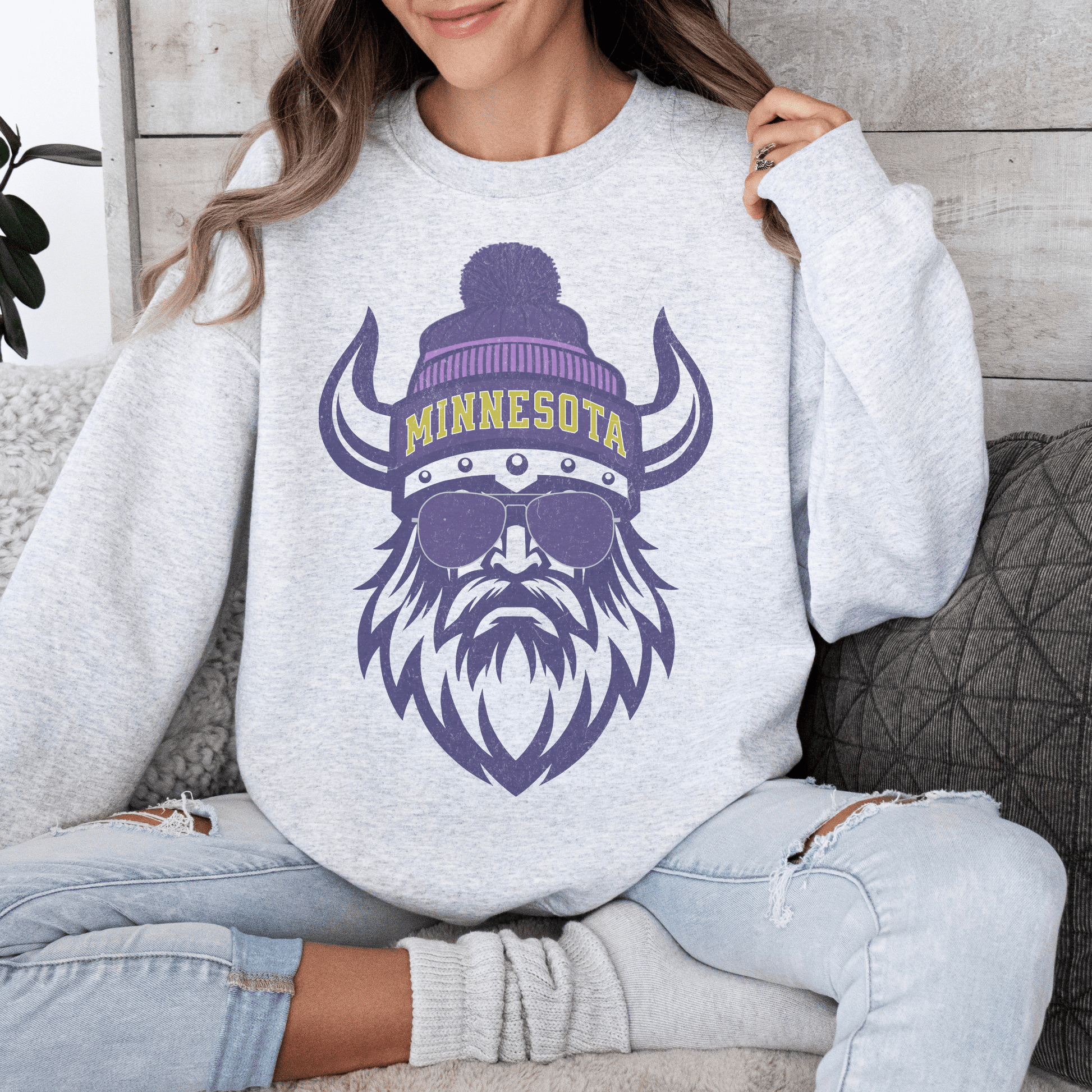 Crafted on the trusted Gildan 18000 Unisex Crewneck Sweatshirt, this piece features a striking outline of a Viking head in rich purple and gold on a classic light heather grey background – a bold yet minimalist nod to your favorite team. The unisex fit ensures a relaxed, easy-to-wear silhouette that flatters all body types, available in sizes S through 3XL so everyone can rep their team in style.