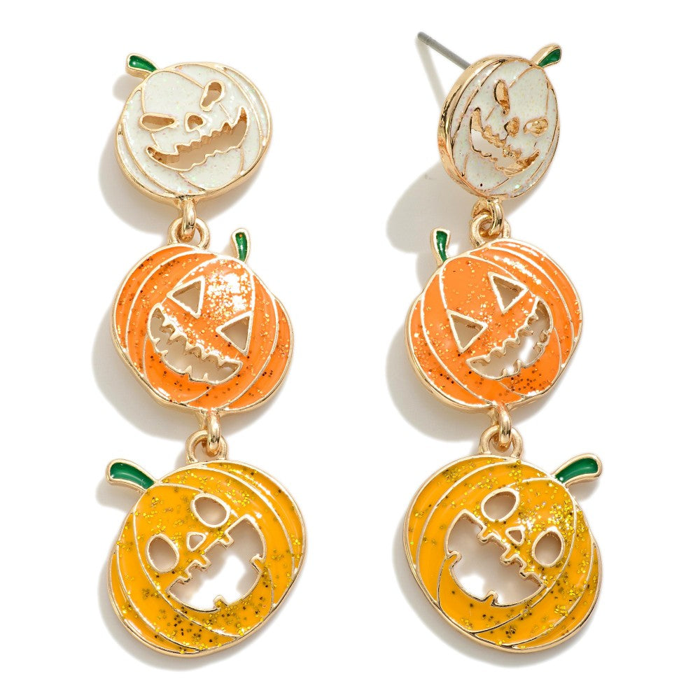 Get ready to embrace the spooky season in style with these Linked Waterfall Halloween Pumpkin Earrings with Glitter Accent! Perfect for adding a fun and festive touch to your Halloween wardrobe, these earrings feature orange and white pumpkins each with their own adorable pumpkin design with a playful waterfall effect. The glitter accents bring just the right amount of sparkle, making these earrings a must-have accessory for any Halloween lover.